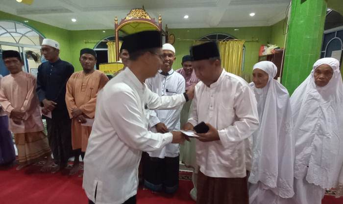 Bupati Karimun Ing Iskandarsyah menyerahkan santunan kepada lansia di Desa Parit, Kecamatan Selat Gelam. (Ilfitra/gokepri.com)