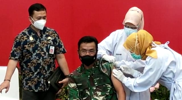 Tanjungpinang (gokepri.com) – Komandan Pangkalan Utama TNI Angkatan Laut (Danlantamal) IV Tanjungpinang Laksamana Pertama TNI Indarto Budiarto bersama Sekda Provinsi Kepri TS Arif Fadillah dan pejabat Forkopimda Provinsi Kepri meneriman suntik vaksin covid-19 Sinovac kedua. Penyuntikan berlangsung di Gedung Daerah, Tanjungpinang, Kepri, Kamis pagi (28/1/2021).