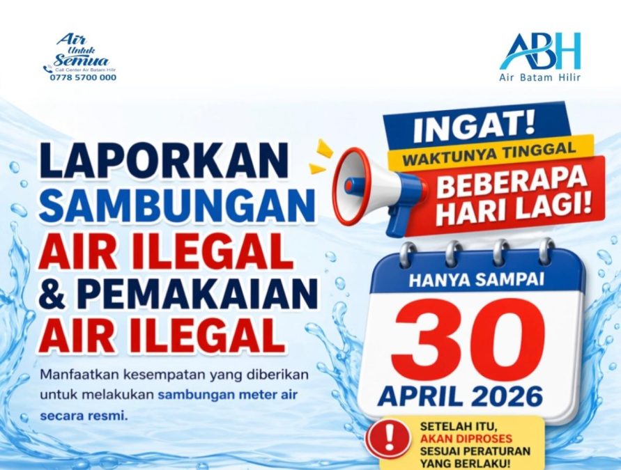 BATAM (gokepri.com) – Air Batam Hilir (ABH) Batam mengungkapkan, demi distribusi air yang lebih merata dan berkualitas di Batam, segera laporkan sambungan atau pemakaian air yang belum terdaftar secara resmi sebelum 30 April 2026.