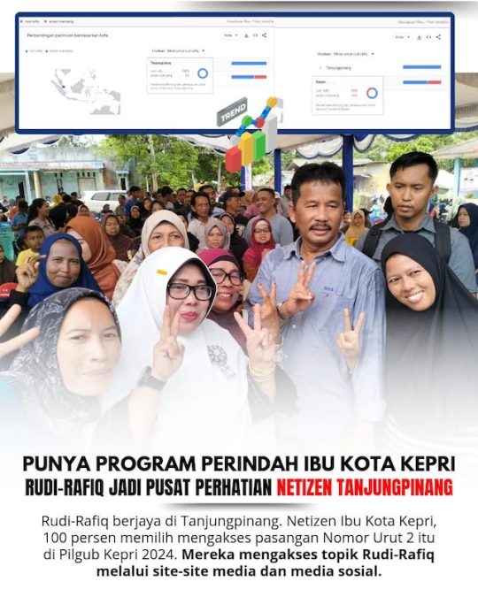 BATAM – Pasangan Rudi-Rafiq meraih popularitas besar di Tanjungpinang. Netizen Ibu Kota Provinsi Kepulauan Riau (Kepri) seratus persen lebih memilih untuk mengakses informasi tentang pasangan calon nomor urut 2 di Pilgub Kepri 2024. Mereka mengikuti perkembangan Rudi-Rafiq melalui situs-situs berita dan media sosial.