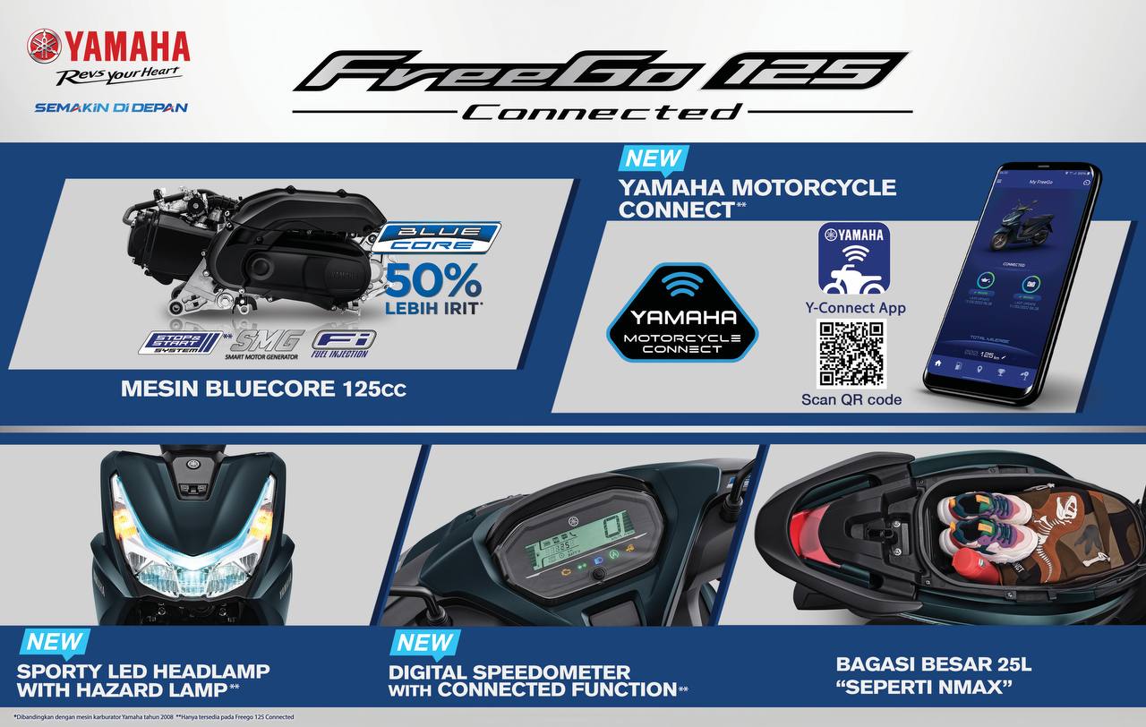 Seperti pada kategori Generasi 125, Yamaha menghadirkan fitur canggih Y-connect yang menyesuaikan kebutuhan konsumen masa kini pada produk terbaru FreeGo 125 Connected. Produk terbaru Yamaha diharapkan dapat semakin menggairahkan market sepeda motor di Indonesia yang terus bertumbuh seiring dengan perubahan era dan selera konsumen.